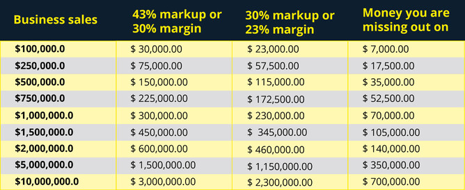 Using the same example, assuming you used a 33% markup (100 x 33% = 33; 100 + 33 = 133), your margin would only be 25% (33 / 133 = 25%).